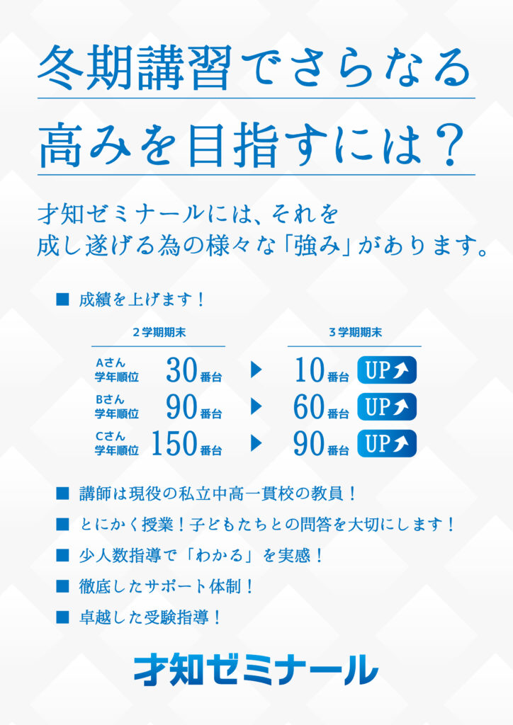 内申点UPを目指し、中間・期末試験で高得点を取るための準備と対策をします。少人数指導で中1・2生は週2日で5科、中3生は週3日で5科を学びます。
